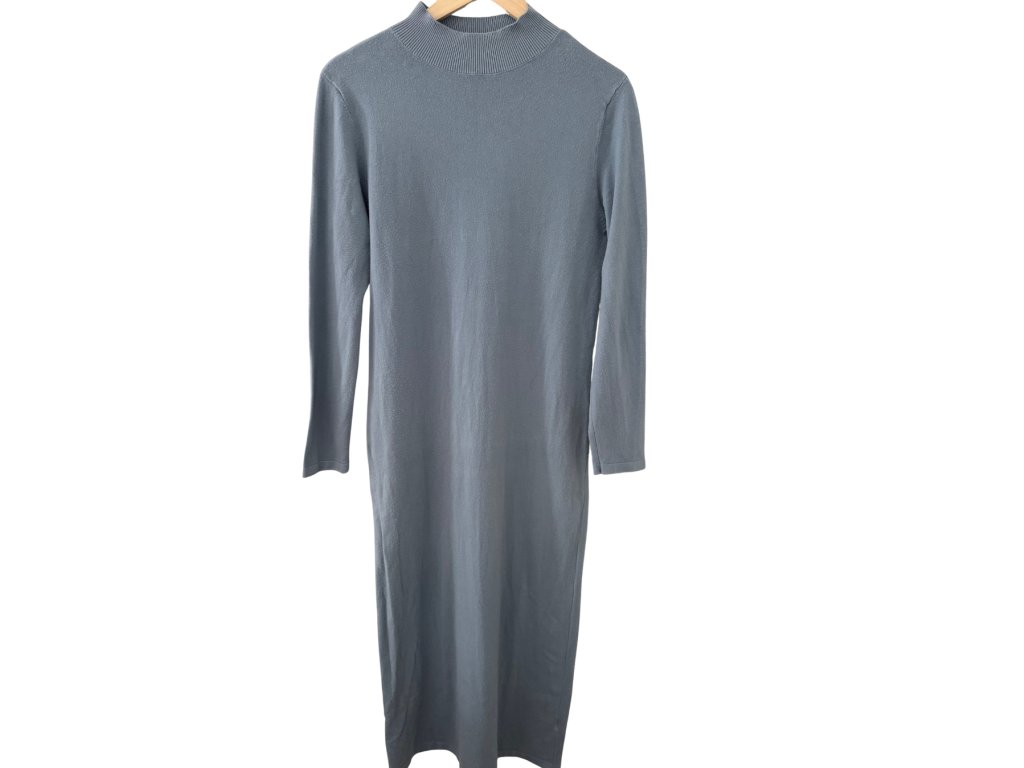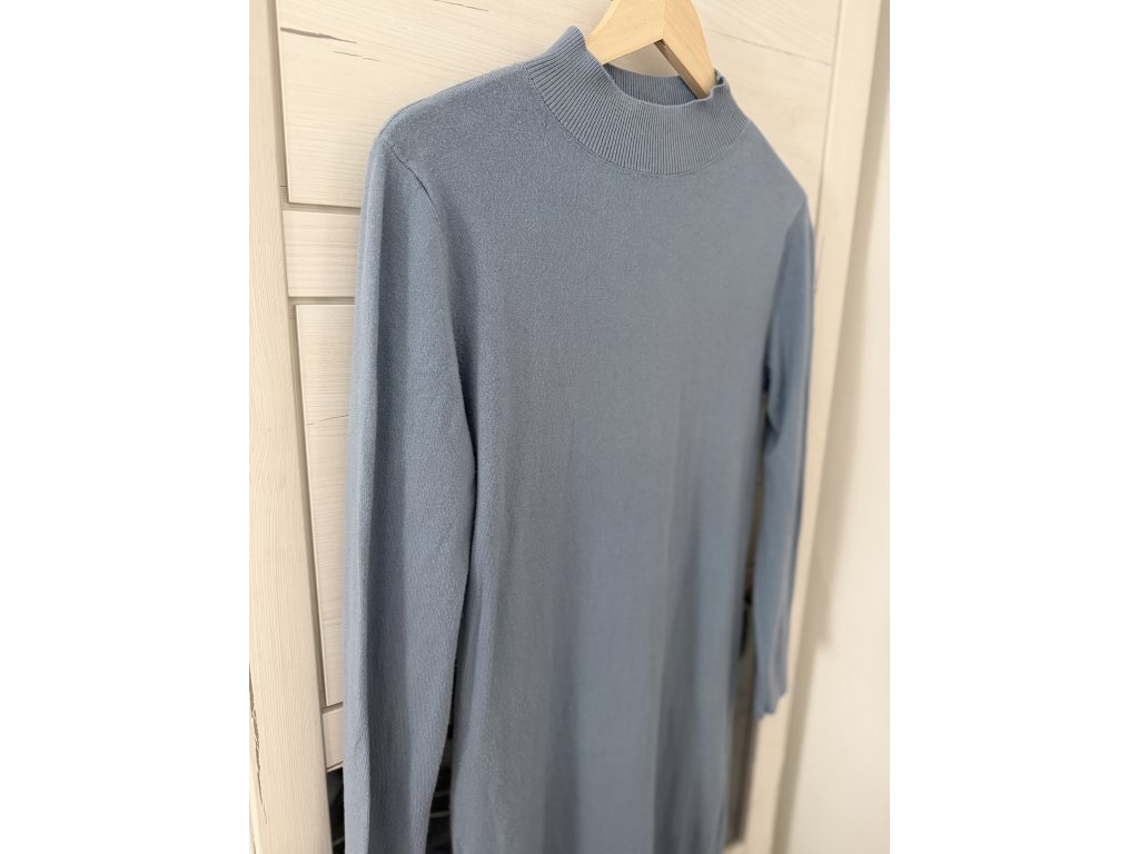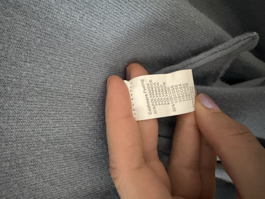 Světle modro šedé šaty, teploučké, měkké, strašně heboučké na dotek. na štítku je napsáno cashmere feeling, a opravdu pocitově krásný materiál. Materiál: 30% viskóza, 30% polyamid, 20% modal, 20% elastan. Jsou hodně pružné, bez cedulky s velikostí i značkou, Podle mě sednou M-XL. Níže jsou rozměry. Na povrchu jsou žmolíky.