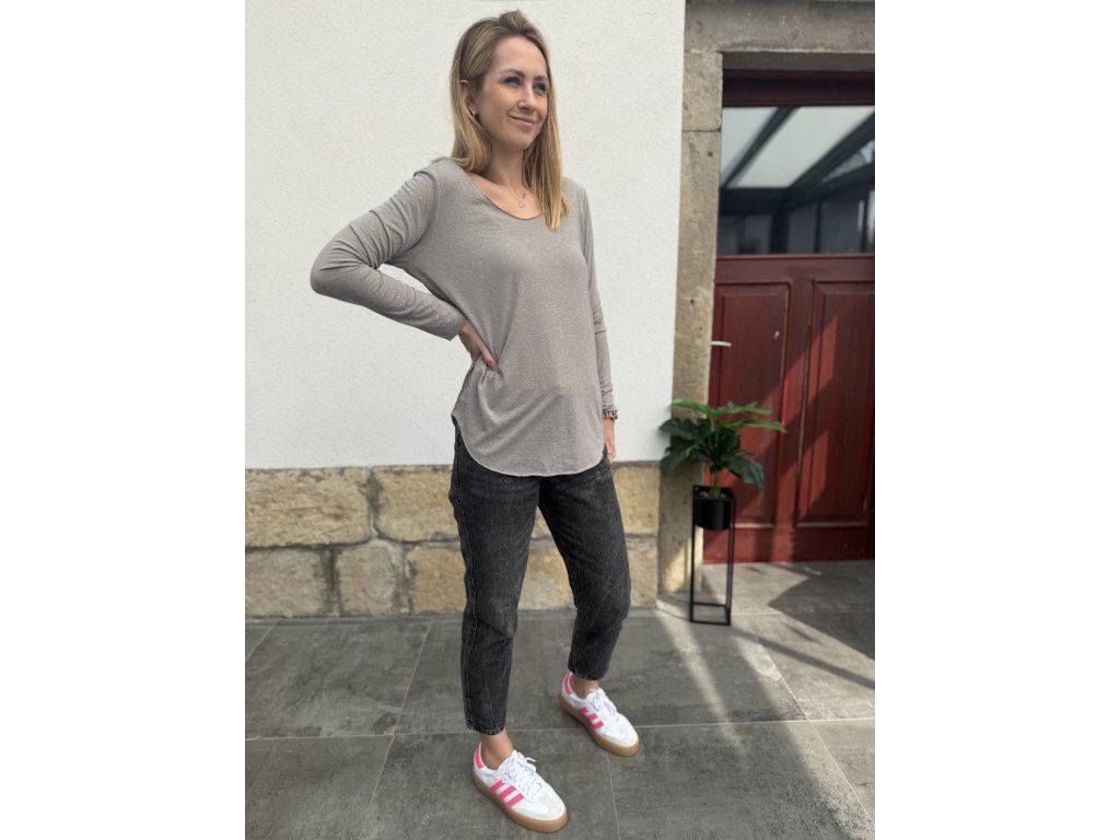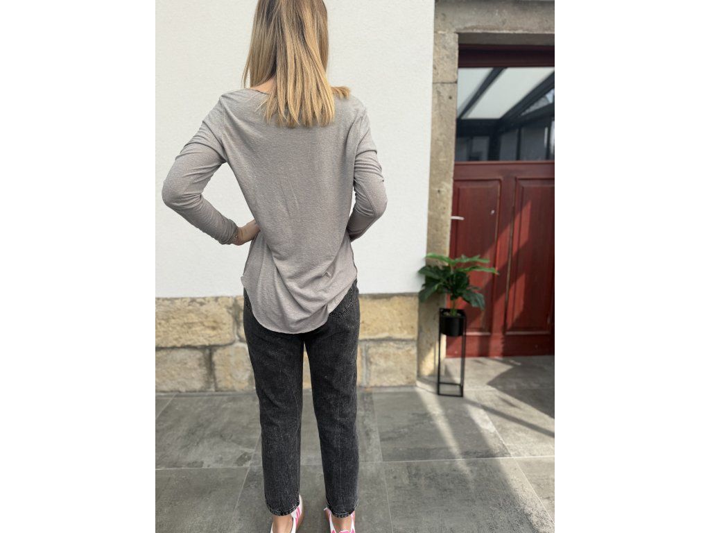 Dámské šedé triko s dlouhým rukávem, je tenké, dlouhé, prodloužené vzadu. Bez cedulky s velikostí i značkou. Jemný žmolík. Sedne hezky asi Lku a menšímu XL. Níže jsou rozměry. Efekt trička naruby.