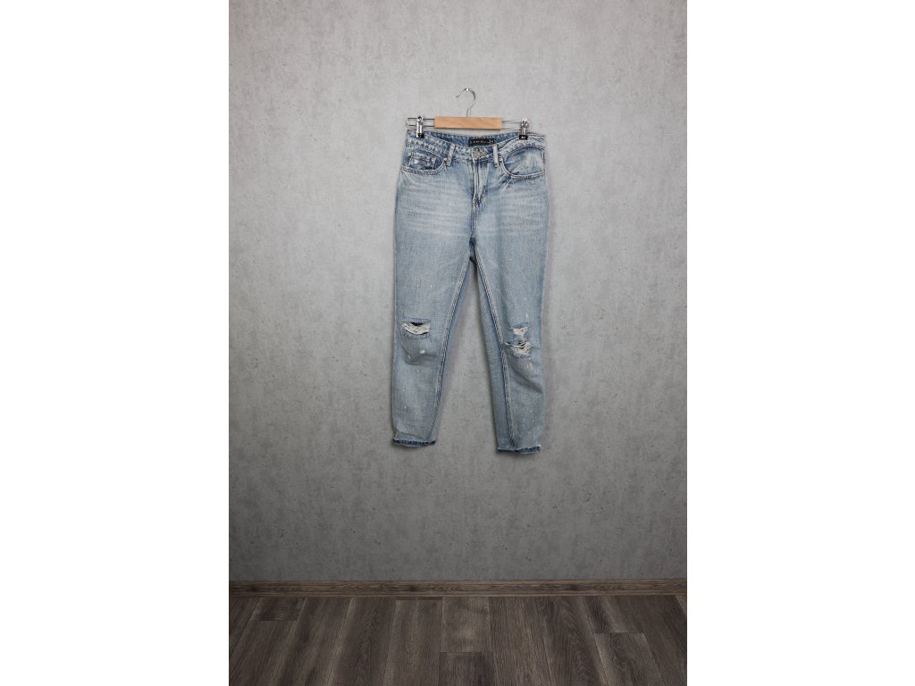 Trhané a cákané džíny AMISU, velikost uvedena 34, hezky sedne 36. Já nosím Mko (38) a jsou mi hodně na těsno. V moc hezkém stavu, bez vady. Je to spíše pevná džínovina, moc nepovolí.